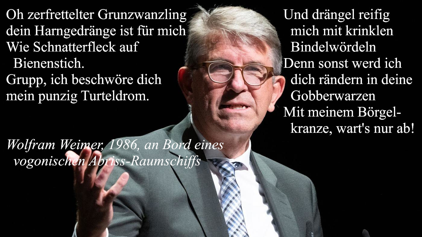Okay, also der Witz ist, dass dieser Politiker unverständliches Zeug schwurbelt wie ein Vogone.